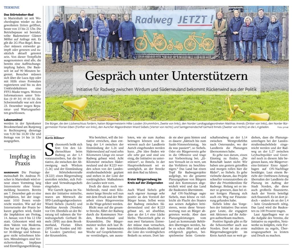 Gespräche mit MdL Wiard Siebels und MdL Mathias Arends, Hilke Looden, der Bürgermeisterin der Gemeinde Krummhörn, Florian Eiben, dem Bürgermeister der Stadt Norden und Gerhard Ihmels, dem Bürgermeister der Samtgemeinde Brookmerland. Außerdem finden erste Kontakte mit der Landesbehörde für Straßenbau in Aurich statt.