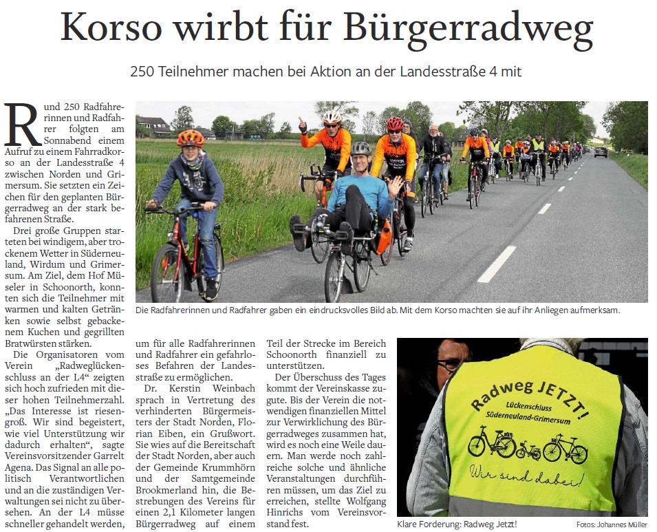 Durch die Sperrung der Bundesstraße ist die L4 umso wichtiger für den Verkehr geworden. Die Notwendigkeit eines Radwegs wird dadurch ebenfalls dringlicher. Sobald der Planfeststellungsbeschluss vorraussichtlich 2026 erfolgt, kann mit dem Erwerb der benötigten Grundflächen begonnen werden. Aktuell sind ca. 30.000€ gesammelt worden. Das entspricht 60% der benötigten Flächen. Der Kassenbericht wurde von Kassenwartin Frauke Habbena vorgestellt. Sämtliche Vorstandsmitglieder wurden erneut gewählt. Yasin Kilic vom Landesamt für Straßenbau und Verkehr, Aurich, erläuterte die kommenden Schritte bis zum Baubeginn. Die Vorplanung des Streckenabschnittes ist in Arbeit. Dank gilt allen Helferinnen und Helfern. Am 01.05. wird der Verein in Norden bei der Maikundgebung anwesend sein. Am 02.06 findet wieder der Radwegtag auf dem Gulfhof Meevenburg statt.