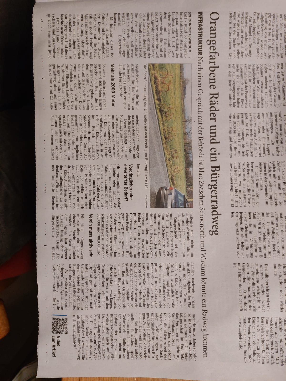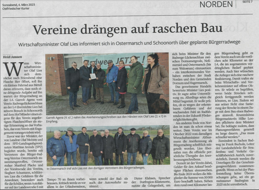 durch die Übergabe des Fahrrades verbunden mit der Hoffnung, dass man sich in nicht allzu ferner Zukunft zum ersten Spatenstich wiedersehen würde. Aber neben dem rund 2 km langen Bürgerradweg geht es dem Verein auch um die restlichen 8 km der L4, die im sogenannten vordringlichen Bedarf geplant werden. Auch hier wünschen die Anlieger sich eine raschere Realisierung. Lies würde es begrüßen, wenn beide Strecken zeitgleich fertig gestellt werden könnten. Zudem sei aus seiner Sicht eine Sanierung der Strecke in einem Zuge mit dem Bau eines Radweges sinnvoll. Lies auf Einladung des Landtagsabgeordneten Mathias Arends nach Schoonorth gekommen. Zudem nahmen die Krummhörner Bürgermeisterin Hilke Looden, Landrat Olaf Meinen sowie Frank