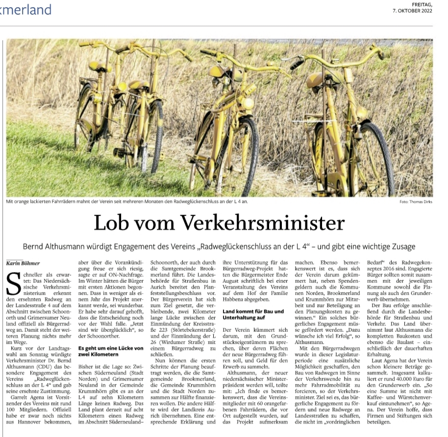 Dr. Bernd Althusmann hat das Engagement des Vereins gewürdigt und sagt zu, dass das Land Niedersachsen nach einem rechtskräftigen Planfeststellungsbeschluss die Baukosten für den Radweg an der L 4 zwischen Friedrichshof und Grimersum-Neuland zu 100 Prozent tragen wird.
