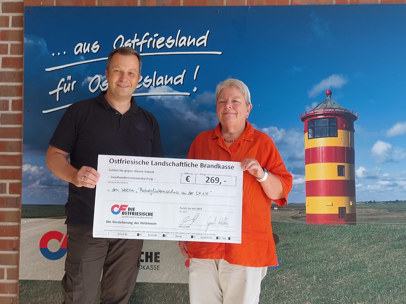 Beim Puzzle-Gewinnspiel der Ostfriesischen Landschaftlichen Brandkasse zugunsten von Vereinen machte auch Karin Agena für ihren Verein „Radweglückenschluss an der L4 e.V.“ mit. Sie gewann 269 Euro, die der Vereinskasse zur Finanzierung des Grunderwerbs für den Bürgerradweg an der L4 zukommen. Unsere Foto zeigt Karin Agena zusammen mit dem Ralf Ludwig, dem Inhaber der Agentur der Brandkasse in Pewsum bei der Übergabe des Spendenschecks.