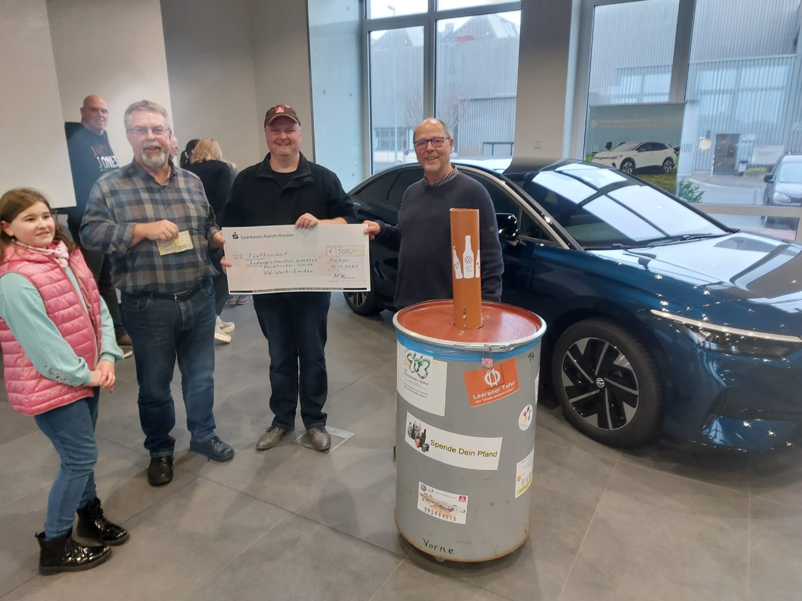 Spenden: Einen symbolischen Spendenscheck über 500 Euro konnten Wolfgang Hinrichs und ich am vergangenen Samstag aus der Hand von Mathias Heims entgegennehmen. Heims ist Initiator einer Pfandflaschensammelaktion im VW-Werk Emden und hat in diesem Jahr mit vielen anderen Kollegen so viele stehengelassene oder weggeworfene Pfandflaschen in den Hallen des Werkes eingesammelt, dass die unglaubliche Summe von über 10.000 Euro an Pfandgeldern zusammengekommen ist. Herr Heims, der in Norden wohnt, fährt fast täglich auf dem Weg zur Arbeit auf der L4 an unseren orangen Fahrrädern und unseren Bannern vorbei. Die Dringlichkeit eines Radweges zwischen Süderneuland und Grimersumer Neuland liegt dabei für ihn auf der Hand. Es sei „eigentlich für Fahrradfahrer lebensgefährlich, die Straße zu benutzen“, sagte er bei der Spendenübergabe. Wir bedanken uns ganz herzlich bei allen VW-Mitarbeitern, die sich an dieser tollen Aktion beteiligt haben und uns damit unterstützen. Mit dieser Spende steigt unser Spendenbarometer zum Jahresende auf fast 30.000 Euro an. Zahlreiche Firmen und Einzelspenderinnen und -spender haben uns im Verlaufe der vergangenen zwölf Monate unterstützt und dieses Ergebnis möglich gemacht. Vielen Dank dafür! Bei verschiedenen Aktionen haben wir in den vergangenen Monaten auf unser Anliegen aufmerksam gemacht. Fast 30 neue Mitglieder konnten wir werben, so dass wir jetzt 128 Mitglieder zählen. Allen neuen Mitgliedern von dieser Stelle noch einmal ein herzliches Willkommen! Sie alle helfen mit, dass unser Anliegen in der öffentlichen Wahrnehmung Gewicht erhält und wir unserem Ziel näherkommen.